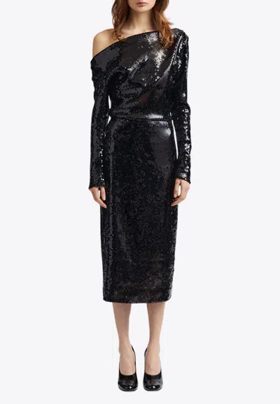 Danae Draped Asymmetric Sequined Crepe Midi Dress In Black
