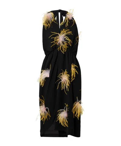 Asymmetric Feather Trim Pleated Crepe Décolletage Dress In Black
