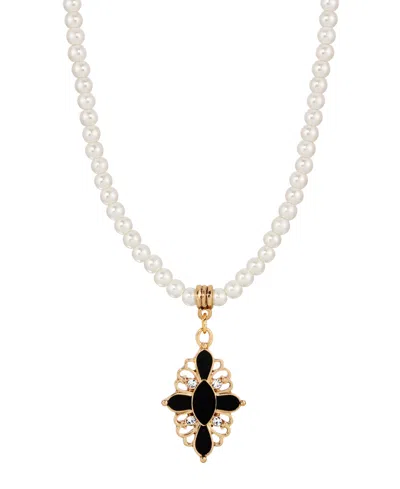Imitation Pearl And Crystal Jet Oval Drop Necklace In White