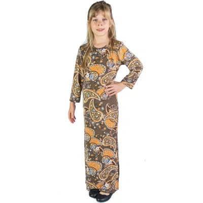 Brown Fall Print Long Sleeve Side Slit Maxi Dress In Multi