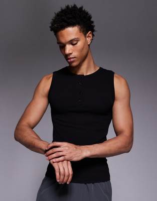 Seamless Rib Knit Slim Fit Henley Tank Top In Black