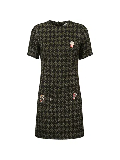 Houndstooth Wool Blend Short Dress In Green