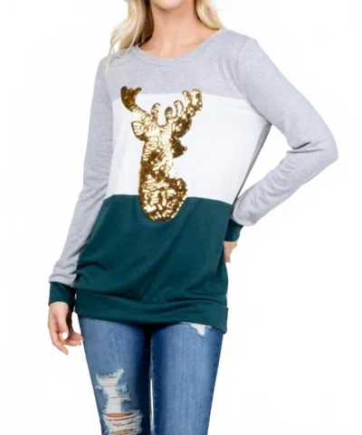 Plus Christmas Reindeer Sequin Long Sleeve Top In Hunter Green In Multi