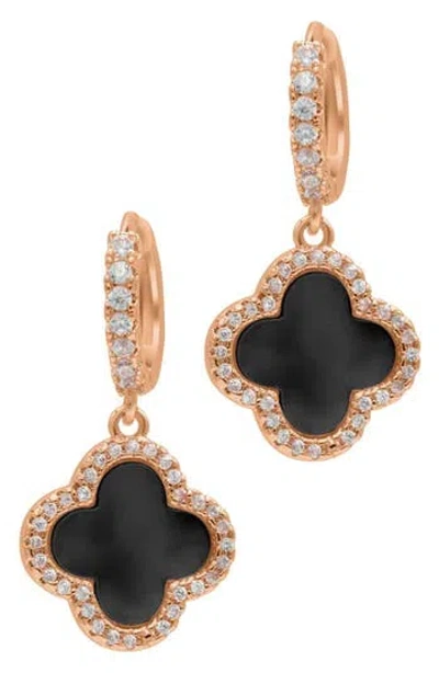 14k Rose Gold Plated Crystal Halo Black Clover Dangle Huggie Earrings In Rosegold/black
