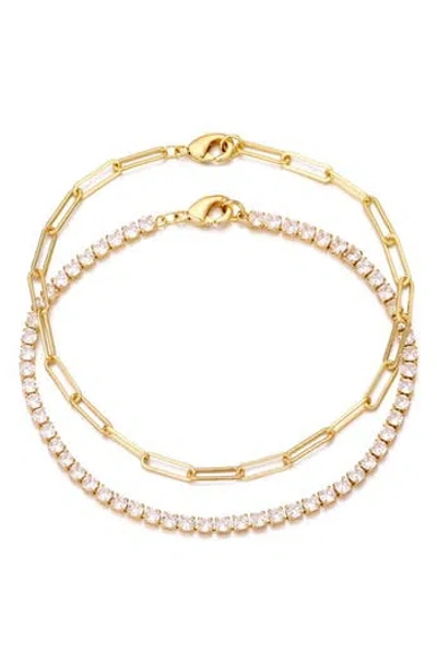 14k Gold Plated Paper Clip Chain & Crystal Tennis Bracelet Set