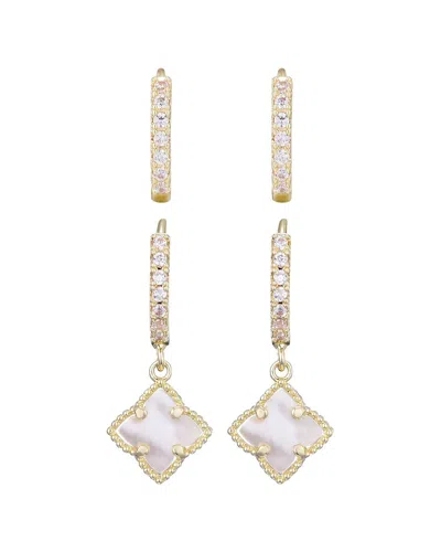 14k Plated Mother-of-pearl Cz Clover Huggie Set Earrings In Gold