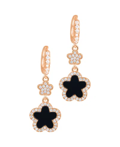 14k Rose Gold Plated Crystal Halo Black Clover Dangle Huggie Earrings In Rosegold/black