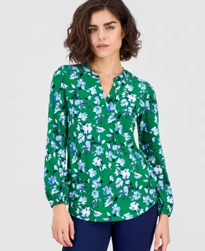 Women's Printed Split-neck Long-sleeve Top In Green