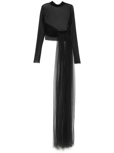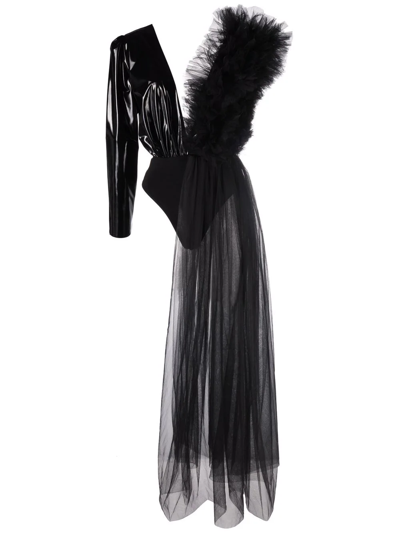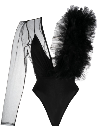 X Lia Aram Asymmetric Tulle Bodysuit In Black