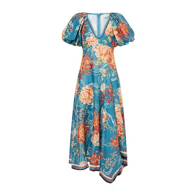 Womens Blue Fletcher Puff-sleeve Ramie Midi Dress In Multi