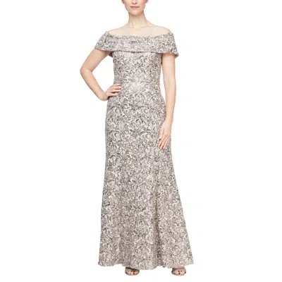Metallic Floral Jacquard Off The Shoulder Gown In Blush Multi