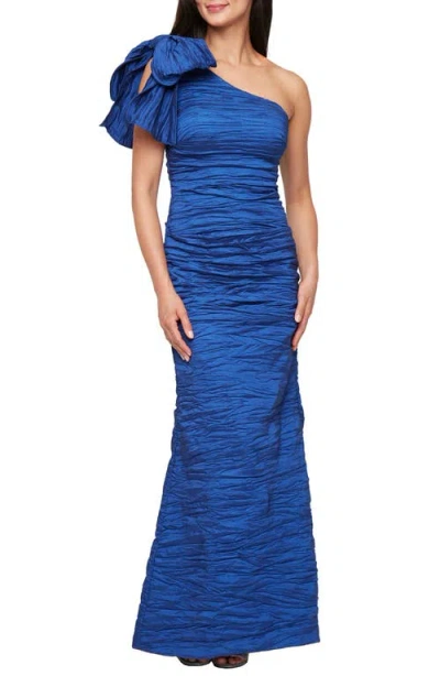 Bow Detail One-shoulder Ruched Satin Gown In Blue