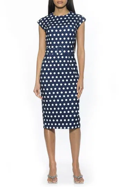 Cap Sleeve Belted Sheath Dress In Navy Polka Dot