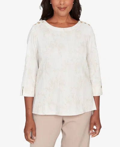 Petite Saratoga Springs Raised Texture Floral Design Knit Top In White