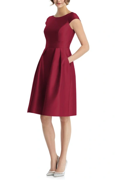 Bateau-neck Cap-sleeve Pleated Skirt Sateen Twill Dress W/ Pockets In Burgundy Red