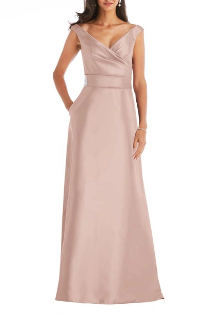 Off-the-shoulder Draped Wrap Satin Maxi Dress In Toasted Sugar
