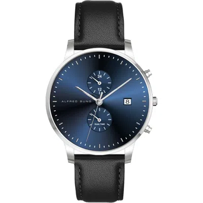 Dual Time Quartz Leather Strap Watch, 42mm In Black Strap Black Dial