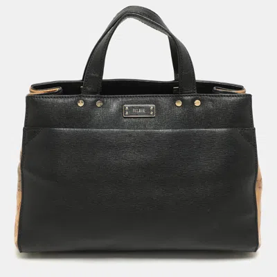 Italian classic chic. The Geo Printed Large 'New Basic' Shoulder Bag by Alviero Martini is part of the 1A Classe line. Featuring geo print fabric, snap leather loop closure that allows for traditional tote form or trapazodial form, lether handles with flat connectors and leather fob with gold tone finishing, leather details and inserts, and gold-tone accents with 1ª Classe logo. Each piece is unique and features slightly different prints. Dust bag included. Made in Italy.