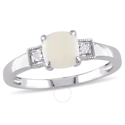 Cushion Cut Opal And Diamond Accent Ring In Sterling Silver In White