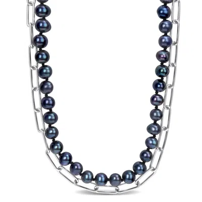 8-9mm Pink Cultured Freshwater Pearl Station Necklace In Sterling Silver In Two-tone
