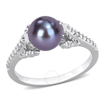 7-7.5mm Black Freshwater Cultured Pearl And Diamond Accent Split Shank Ring In Sterling Silver In White