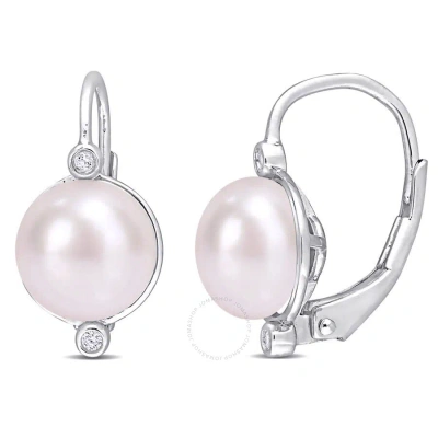 7.5-8mm Freshwater Cultured Pearl And Diamond Accent Leverback Earrings In Sterling Silver In White