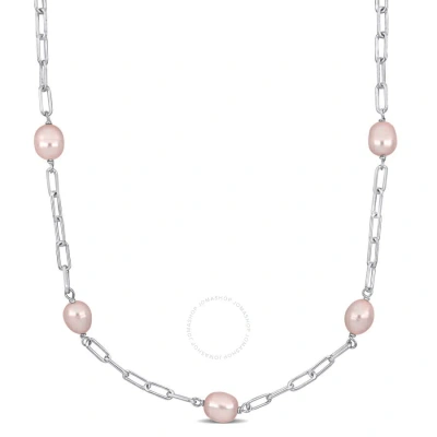 8-9mm Pink Cultured Freshwater Pearl Station Necklace In Sterling Silver In Two-tone