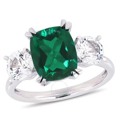4 Ct Tgw Cushion-cut Created Emerald And Created White Sapphire Three-stone Ring In 10k White In Two Tone / Emerald / Gold / Gold Tone / White