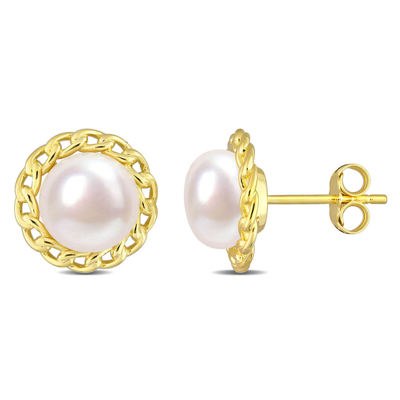 8-8.5mm Cultured Freshwater Pearl Halo Link Stud Earrings In Yellow Plated Sterling Silver