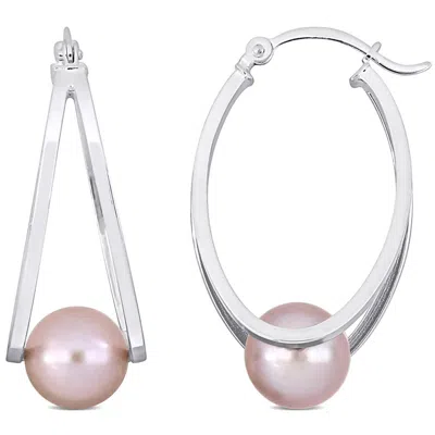 8-8.5mm Freshwater Cultured Pink Pearl Hoop Earrings In Sterling Silver In White