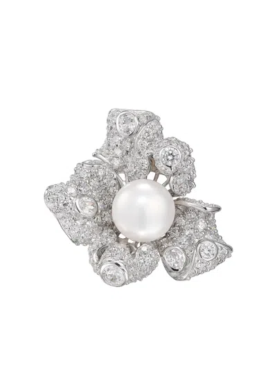 Rhodium Vermeil Moderne Pearl And Diamond Earrings In Metallic
