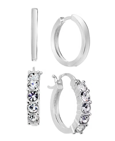 Duo Crystal And High Polished Earring Hoop, Set Of 2 In Silver Plated
