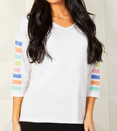 3/4 Sleeve Stripe V Neck Top In White Combo