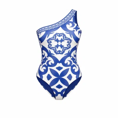 Women's Blue / White Santorini Inspired One Shoulder One Piece Swimsuit