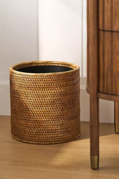Handwoven Rattan Round Waste Basket With Metal Liner In Brown