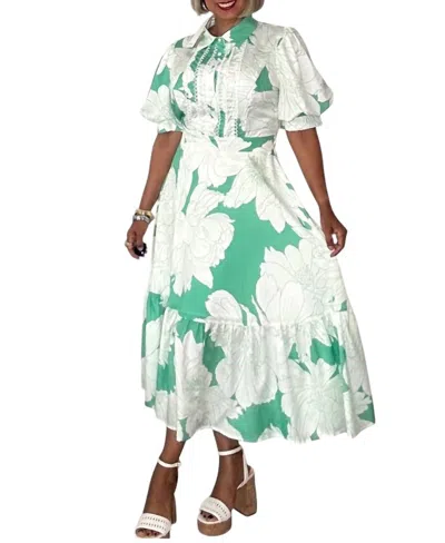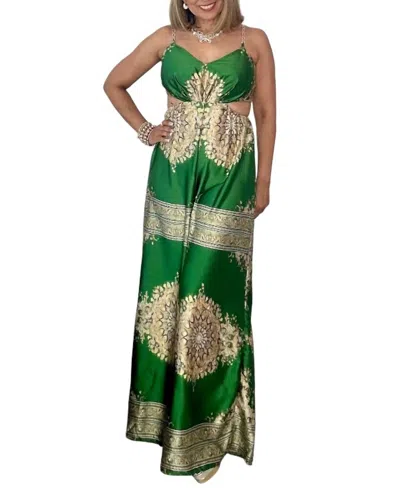 Notched Flared V-neck Maxi Dress In Multi In Green