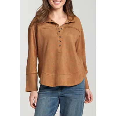 Faux Leather Henley Top In Brown