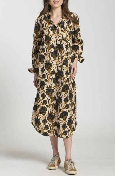 Leaf Print Tie Waist Cotton Camp Shirt In Black Multi