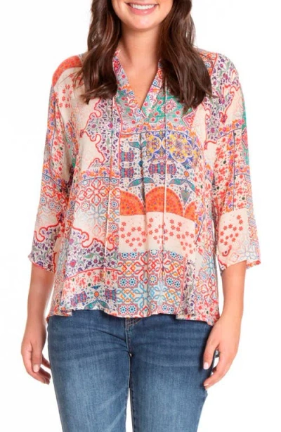 Print Tassel Split Neck Chiffon Top In Pink/blue Multi