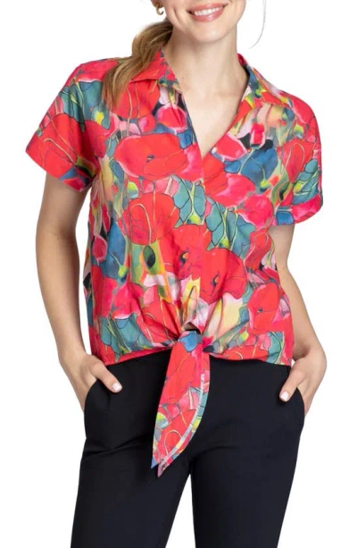 Floral Tie Front Cotton Camp Shirt In Red Multi