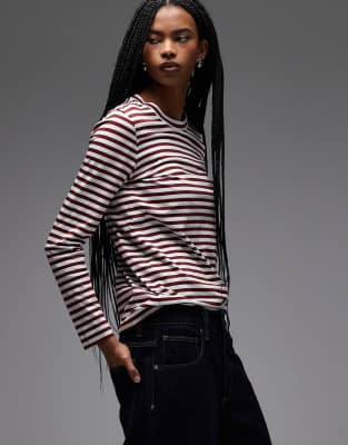 Oversized Long Sleeve Jersey T-shirt With Open V Neck And Side Splits In Brown