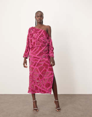 Embellished Drape Off Shoulder Raw Edge Abstract Sequin Maxi Dress In Pink