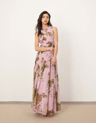 Linear Floral Asymmetric Column Maxi Dress In Blue