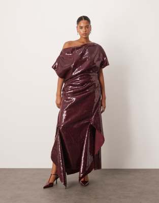 Curve Sequin Draped Bodice Square Cut Hem Midi Dress In Burgundy