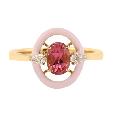 Women's Natural Oval Pink Tourmaline & Diamond Enamel Ring In 18k Gold