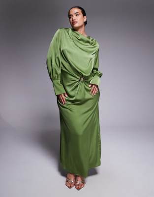 Asos Design Curve Twist Front Bias Cut Satin Maxi Dress With Gold Tone Hardware In Green
