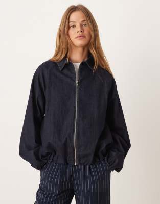 Nylon Ruched Funnel Neck Bomber Jacket In Blue