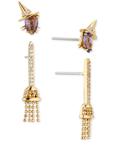 18k Gold-plated 2-pc. Set Mixed Stone Witch Cat & Broomstick Earrings