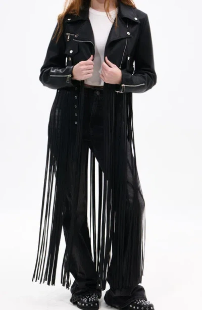 Maxi Fringe Faux Leather Moto Jacket In Black