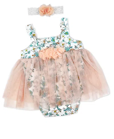 Baby Girls 2 Piece Peach Floral Romper With Tulle Over Skirt And Matching Headband